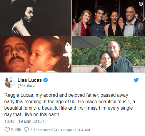 "Регги Лукас, мой обожаемый и любимый отец, умер сегодня рано утром в возрасте 65 лет. Он создал прекрасную музыку, прекрасную семью, прекрасную жизнь и я буду скучать по нему каждый день, что я живу на этой земле".