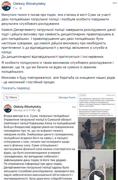 Об этом сообщил первый заместитель начальника департамента патрульной полиции Алексей Белошицкий на своей странице в Facebook.