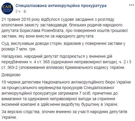 "Напоминаем, народный депутат подозревается в совершении действий предусмотренных ч.4 ст.368 (получение неправомерной выгоды), ч.2 и 3 ст.369-2 (злоупотребление влиянием) Уголовного кодекса Украины", - отмечают в САП.