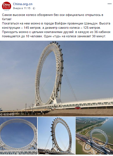 Самое высокое в мире колесо обозрения запустили в Китае. Его уникальность также заключается в отсутствии центральной оси. Покататься на новом необычном аттракционе можно в городе Вэйфан провинции Шаньдун. Об этом сообщает ресурс China.org.cn на своей странице в Facebook.