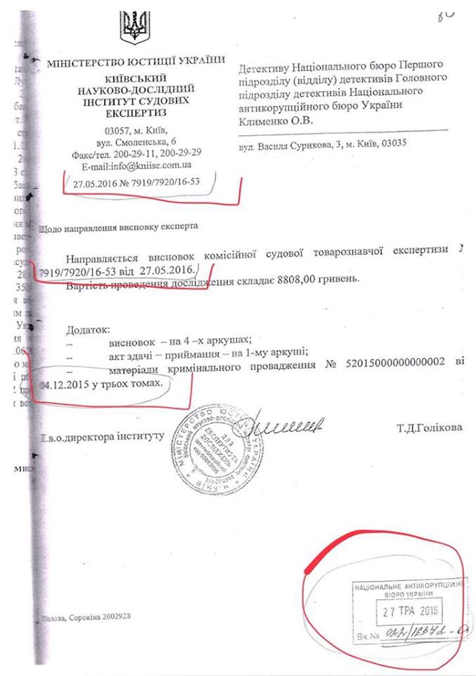 "Это документы, на которых покойный судья Бобровник (судья Андрей Бобровник умер на прошлой неделе - Прим.Ред.) выносил судебные решения. Экспертиза это главный документ, на основе которого базируется все обвинение. Однако выяснилось, что в деле под одним тем же номером существует две разные экспертизы, и все это зафиксировано печатью НАБУ", - комментирует он, обращая внимание, что под одним и тем же исходящим номером и датой не может проходить два идентичных по форме, но разных по сути документа.