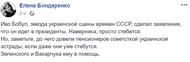 "Иво Бобул, звезда украинской сцены времен СССР, сделал заявление, что он идет в президенты. Наверняка, просто стебется. Но, заметьте, до чего довели пенсионеров советсткой украинской эстрады, если даже они уже стебутся".