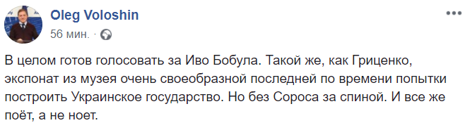 "В целом готов голосовать за Иво Бобула. Такой же, как Гриценко, экспонат из музея очень своеобразной последней по времени попытки построить Украинское государство. Но без Сороса за спиной. И все же поёт, а не ноет", - пишет политолог Олег Волошин.