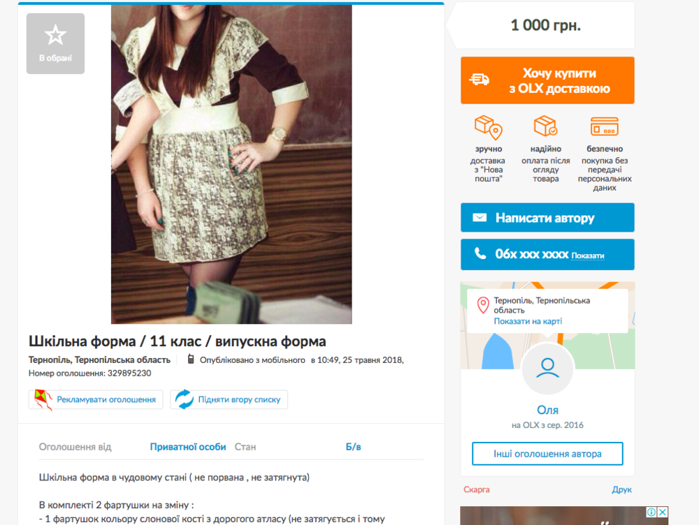 Жительница Тернополя продает в интернете за 1000 грн школьную форму, которая напоминает советскую. Источник фото: olx.ua