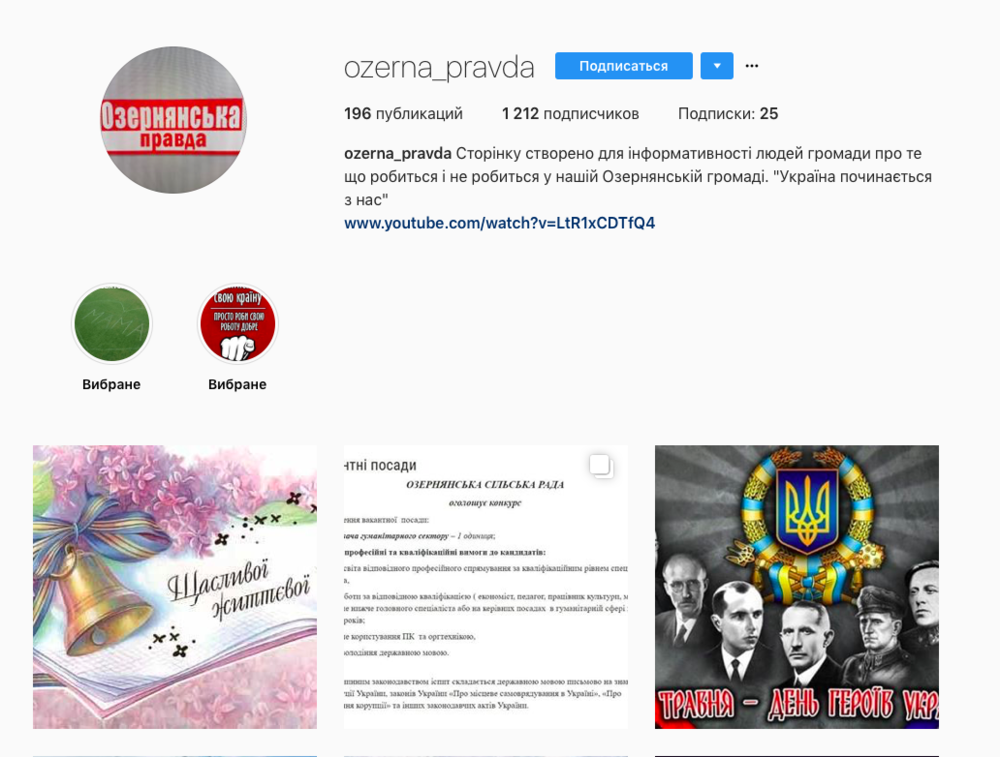 Автор страницы села в Instragram, где наиболее свежие посты посвящены последнему звонку и Дню героев с плакатом, на котором Бандера и Шухевич, уверял нас, что со следующего года в местной школе поменяют форму: "На первый звонок, например, все приходят в вышиванках. А коричневые формы с фартуками надевают не только в Озерной, но и в других селах, и в Тернополе".