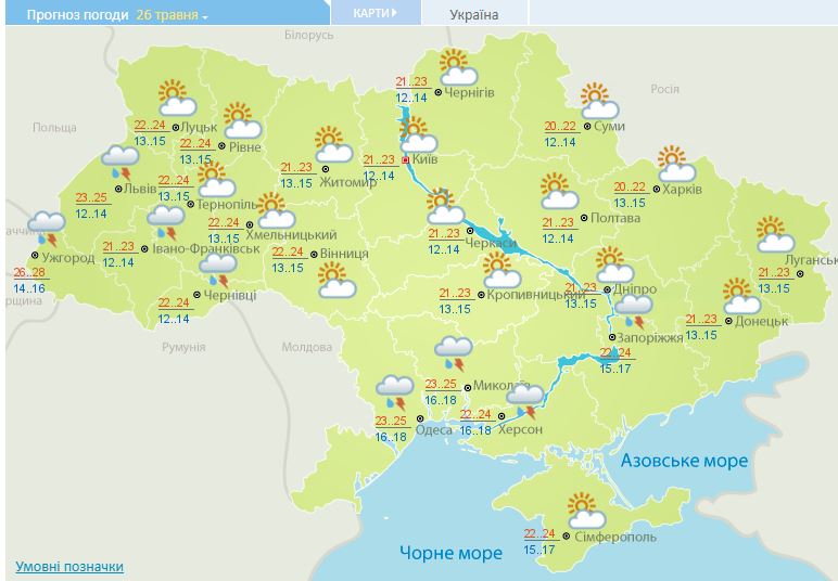 Температура ночью 11-16 градусов (в Черниговской и Сумской областях 8-13 градусов), на юге 14-19; днем 19-25, на Закарпатье 25-29 градусов тепла.