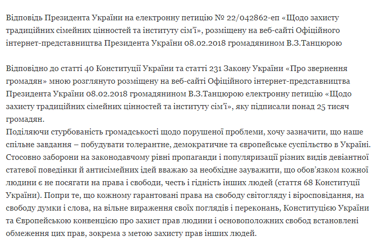 Президент Петр Порошенко дал ответ на петицию о защите традиционных семейных ценностей и института семьи, которая набрала необходимые для просмотра главой государства 25 000 подписей.