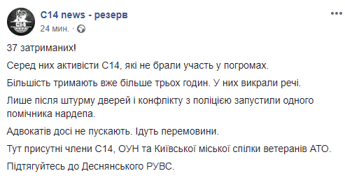 "Среди них активисты С14, которые не участвовали в погромах. Большинство держат уже более трех часов. У них отобрали вещи. Лишь после штурма дверей и конфликта с полицией запустили одного помощника народного депутата. Адвокатов до сих пор не пускают. Идут переговоры", - сказано в сообщении радикалов.
