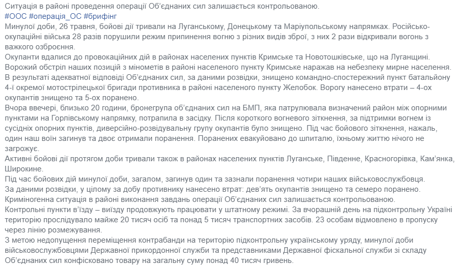 За минувшие сутки на Донбассе погиб один украинский военнослужащий и еще четверо военных получили ранения.