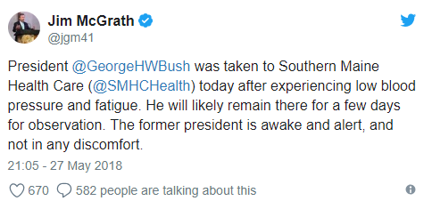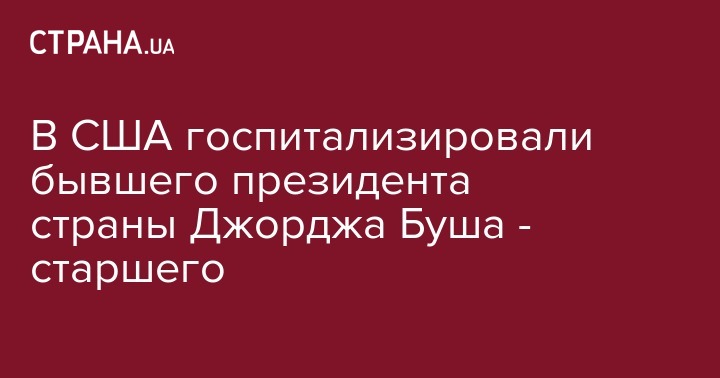 Сегодня, 27 мая, экс-президента США Джорджа Буша - старшего госпитализировали в штате Мэн из-за низкого кровяного давления. Об этом сообщает официальный представитель семьи Джим Макграт в Twitter.