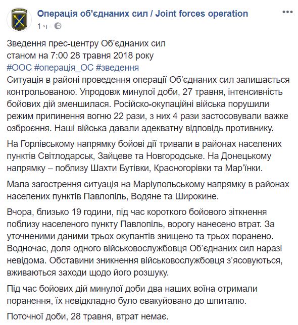 "Судьба одного военнослужащего Объединенных сил пока неизвестна. Обстоятельства исчезновения военнослужащего выясняются, принимаются меры по его розыску ", - подчеркнули в пресс-центре.