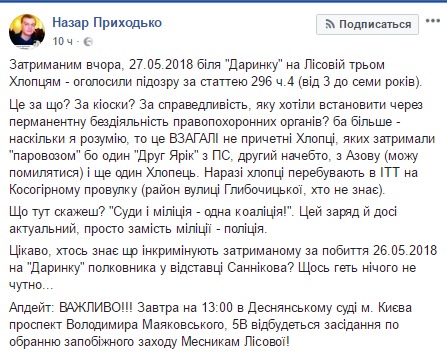 "Задержанным вчера, 27.05.2018 у "Дарынка" на Лесной трем ребятам объявили подозрение по статье 296 ч.4 (от 3 до 7 лет), - написал он.