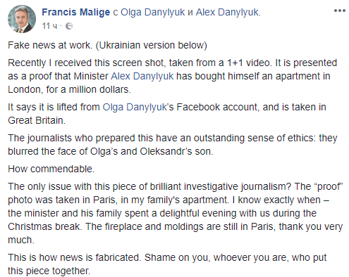 "Недавно я получил этот скриншот, сделанный из передачи 1+1. В сюжете изображение на скриншоте приводится как доказательство того, что министр финансов Александр Данилюк якобы приобрел квартиру в Лондоне за миллион долларов. В сюжете также говорится, что фото сделано в Великобритании и взято с фейсбук страницы Ольги Данилюк",- пишет банкир.