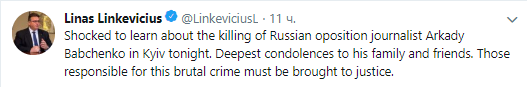 "Ошеломлен вестью об убийстве российского журналиста-оппозиционера Аркадия Бабченко в Киеве сегодня вечером. Глубокие соболезнования его семье и друзьям. Те, кто несет ответственность за это жестокое преступление, должны быть привлечены к ответственности", - написал глава МИД Литвы Линас Линкявичюс.