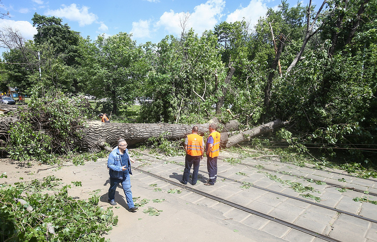Сообщается о шести пострадавших из-за падения деревьев в Москве. В том числе пострадали двое детей, а в Савеловском районе порывом сорвало рекламный щит, который упал на пожилую женщину.