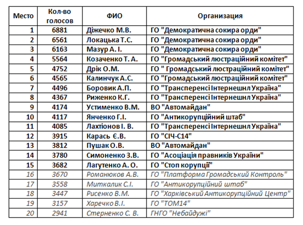 Лидеры голосования – трое представителей общественной организации с феерическим названием "Демократический топор орды" (ГО "Демократична сокира орди" – укр.) Максим Дижечко, Анатолий Мазур и Татьяна Локацкая. Каждый из них набрал более 6 тысяч голосов.