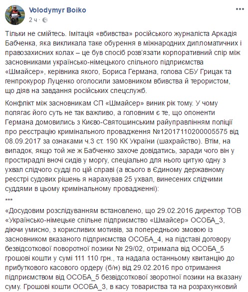 Журналист Владимир Бойко выдвинул версию, что обвинения Бориса Германа в убийстве российского журналиста Аркадия Бабченко - это был способ решить корпоративный спор между учредителями украинского-германского совместного предприятия "Шмайсер".