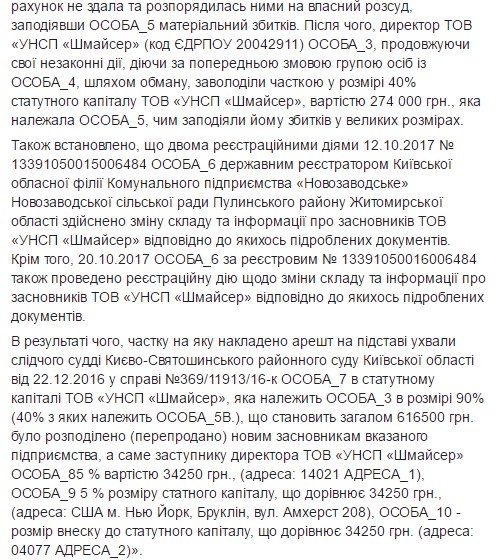 Согласно нему Герман середине декабря 2016 года внес в протокол собрания неправдивые данные. Следователь также обвинил 10%-го участника ООО в том, что совместно с владельцем на тот момент 50% доли и директором УНСП Антониной Капилян они провели без кворума собрание и незаконно исключили из состава участников владельца 40% Валерия Павлюка, который и стал инициатором этого уголовного дела, возбужденного в сентябре 2017 года.