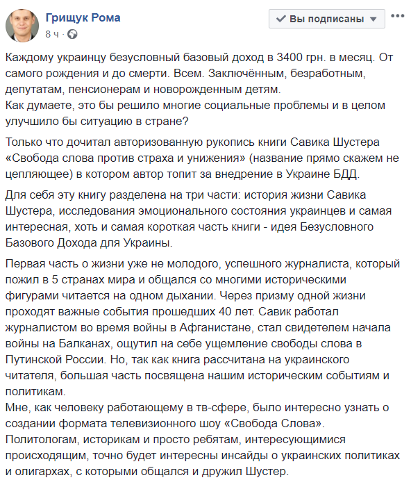 "Базовый доход должно выплачивать государство от самого рождения и до смерти. Всем. Заключённым, безработным, депутатам, пенсионерам и новорожденным детям", – заявил Шустер позже на презентации своего труда в Киеве.
