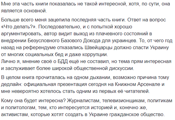 Именно этот – уже третий – раздел книги больше всего напоминает предвыборную программу. Он говорит о необходимости введения базового дохода для каждого украинца, независимо от социального положения.