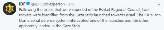 "Два запуска ракет по израильской территории были произведены из сектора Газа. Одна из ракет была перехвачена системой ПВО "Железный купол", вторая упала на территорию сектора Газа", - говорится в сообщении.