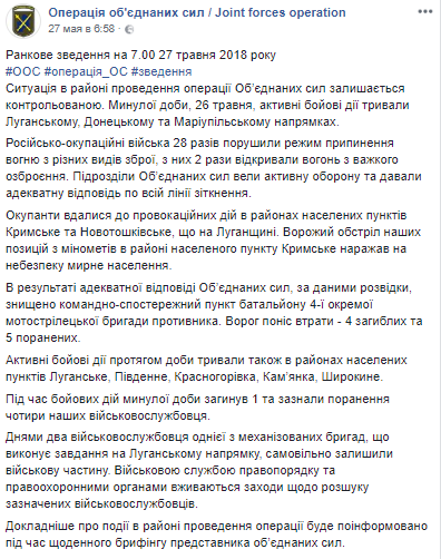 "26 мая двух военнослужащих похитили диверсионно-разведывательные группы противника. В течение недели ничего не было известно о судьбе наших военнослужащих", - сообщается в заявлении бригады в Facebook.