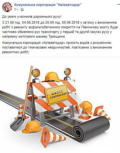 В сообщении говорится о том, что с 21:00 4 июня до 20:00 5 июня перекроют первую и вторую полосы движения в направлении жилого массива Троещина. Здесь будут проводиться работы по ремонту асфальтобетонного покрытия.