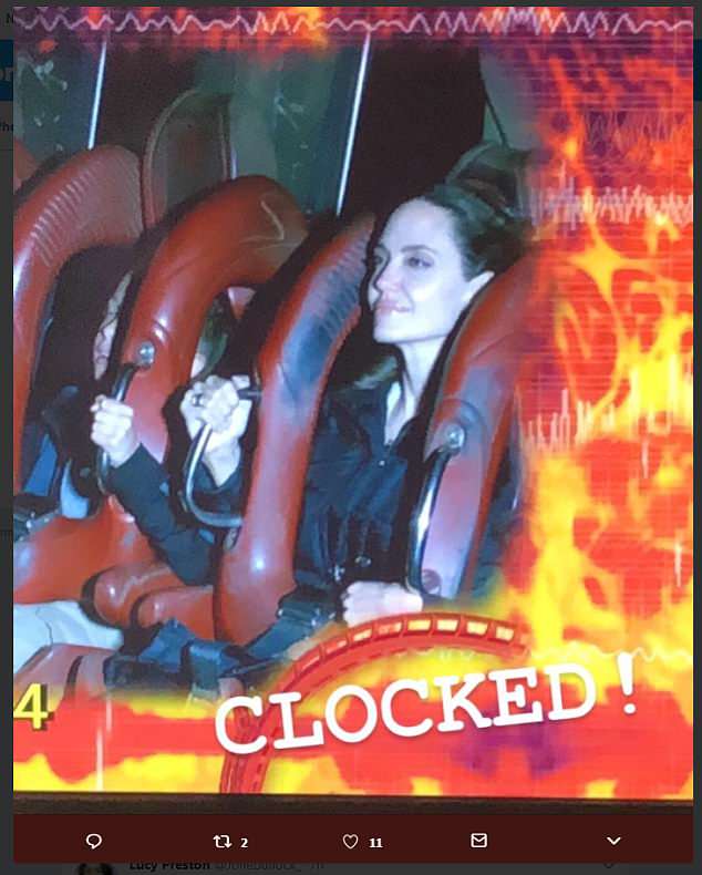 Изображение улыбающейся Джоли на американских горках появилось на огромных табло, установленных в парке. На экранах обычно показывают всех посетителей аттракциона. Снимок быстро распространился в соцсетях.