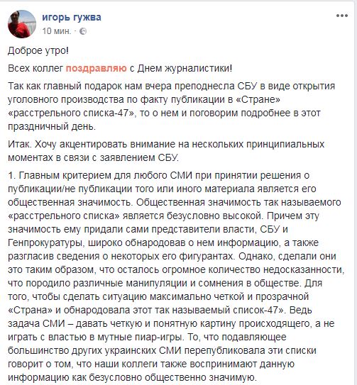Поэтому главный редактор "Страны" Игорь Гужва назвал происходящее давлением на издание и его журналистов. Об этом он написал на своей странице в Facebook.