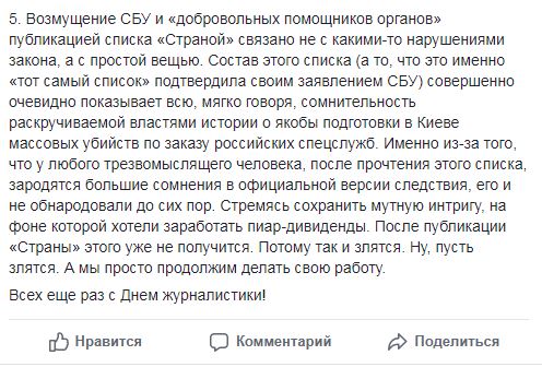 5. Возмущение СБУ и "добровольных помощников органов" публикацией списка "Страной" связано не с какими-то нарушениями закона, а с простой вещью. Состав этого списка (а то, что это именно "тот самый список" подтвердила своим заявлением СБУ) совершенно очевидно показывает всю, мягко говоря, сомнительность раскручиваемой властями истории о якобы подготовки в Киеве массовых убийств по заказу российских спецслужб. Именно из-за того, что у любого трезвомыслящего человека, после прочтения этого списка, зародятся большие сомнения в официальной версии следствия, его и не обнародовали до сих пор. Стремясь сохранить мутную интригу, на фоне которой хотели заработать пиар-дивиденды. После публикации "Страны" этого уже не получится. Потому так и злятся. Ну, пусть злятся. А мы просто продолжим делать свою работу", - написал главный редактор "Страны" и поздравил коллег с Днем журналиста, который отмечается сегодня, 6 июня.