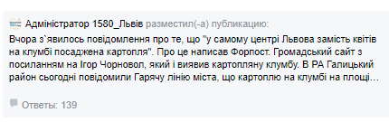 В центре Львова на клумбе на площади Старый Рынок неизвестные высадили картошку. Об этом сообщили в райадминистрации Галицкого района в Facebook.