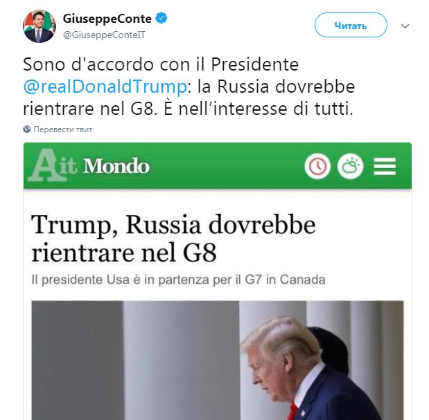 Сегодня, 8 июня новый премьер-министр Италии Джузеппе Конте поддержал позицию президента США Дональда Трампа, который выступил за то, чтобы Россия снова присоединилась к встречам "Большой семерки" (G7).