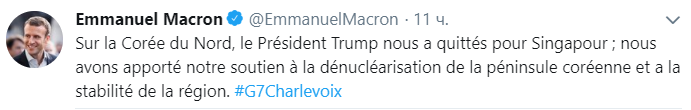 Вообще Twitter французского президента – это какой-то каталог упреков и подколов в отношении американской позиции на саммите G7. Вот несколько цитат: