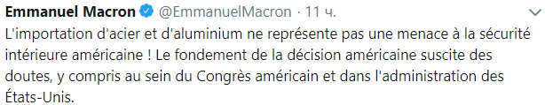 "Импорт стали и алюминия не представляет угрозы американской национальной безопасности! Основания американского решения (о тарифах. – Прим. ред.) вызывают сомнения, в том числе в американском Конгрессе и в администрации Соединенных Штатов".
