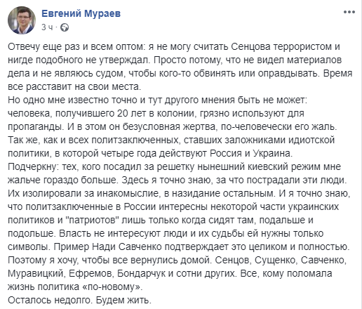 "Отвечу еще раз и всем оптом: я не могу считать Сенцова террористом и нигде подобного не утверждал. Просто потому, что не видел материалов дела и не являюсь судом, чтобы кого-то обвинять или оправдывать. Время все расставит на свои места. Но одно мне известно точно и тут другого мнения быть не может: человека, получившего 20 лет в колонии, грязно используют для пропаганды. И в этом он безусловная жертва, по-человечески его жаль. Так же, как и всех политзаключенных, ставших заложниками идиотской политики, в которой четыре года действуют Россия и Украина. Подчеркну: тех, кого посадил за решетку "нынешний киевский режим" мне жальче гораздо больше. Здесь я точно знаю, за что пострадали эти люди. Их изолировали за инакомыслие, в назидание остальным. И я точно знаю, что политзаключенные в России интересны некоторой части украинских политиков и "патриотов" лишь только когда сидят там, подальше и подольше. Власть не интересуют люди и их судьбы - ей нужны только символы. Поэтому я хочу, чтобы все вернулись домой. Сенцов, Сущенко, Савченко, Муравицкий, Ефремов, Бондарчук и сотни других", - написал Мураев.