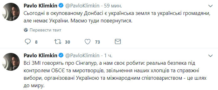 "Все СМИ говорят о Сингапуре, а у нас своя задача: реальная безопасность под контролем ОБСЕ и миротворцев, освобождение наших детей и реальные выборы, организуемые Украиной и международным сообществом - это путь к миру", - написал Климкин.