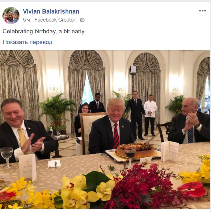Президент США Дональд Трамп, который в настоящий момент пребывает в Сингапуре и готовится ко встрече с лидером КНДР Ким Чен Ыном, получил в подарок торт раньше срока.