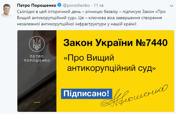"Сегодня в этот исторический день - годовщину безвизоа - подписываю Закон "О Высшем антикоррупционном суде". Это - ключевая веха завершения создания независимой антикоррупционной инфраструктуры в нашей стране!", - написал президент в Тwitter.