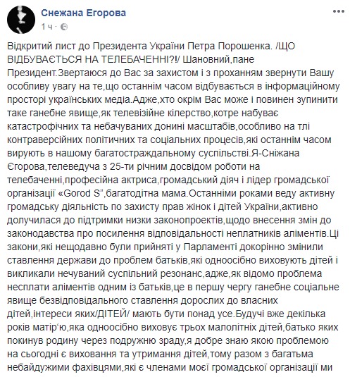 Егорова обратилась к Порошенко не только как к Гаранту Конституции, но и как "к мужу и многодетному  отцу, ради общего будущего всех детей и матерей Украины".