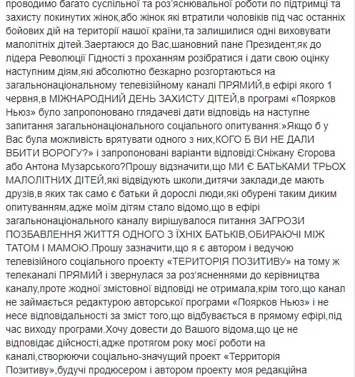 "Обращаюсь к Вам, уважаемый господин Президент, как к лидеру Революции Достоинства с просьбой разобраться и дать свою оценку  действиям, которые совершенно безнаказанно разворачиваются на общенациональном телевизионном канале ПРЯМОЙ", - написала она.