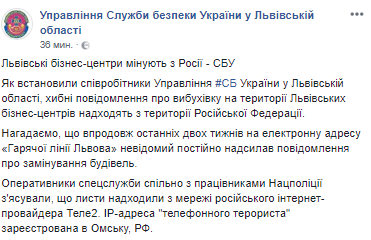 "Как установили сотрудники Управления СБУ во Львовской области, ложные сообщения о взрывчатке на территории Львовских бизнес-центров поступают с территории Российской Федерации", - говорится в сообщении.