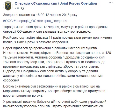 Незаконные вооруженные формирования на востоке Украины с начала суток по состоянию на 18:00 вторника 11 раз нарушали режим прекращения огня, из которых 4 раза из тяжелого вооружения, один украинский военный погиб сообщается на странице Операции объединенных сил в соцсети Facebook.