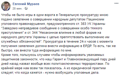 "Чтобы не было игры в одни ворота в Генеральную прокуратуру мною подано заявление о совершении народным депутатом Пашинским уголовного правонарушения, предусмотренного ст.383 Уголовного кодекса Украины "заведомо неправдивое сообщение о совершении особо тяжкого преступления" и ст. 344 "Незаконное влияние в любой форме на народного депутата Украины с целью препятствовать выполнению им служебных обязанностей", - написал он в Facebook.