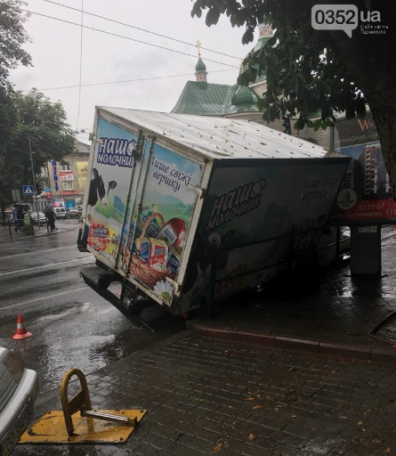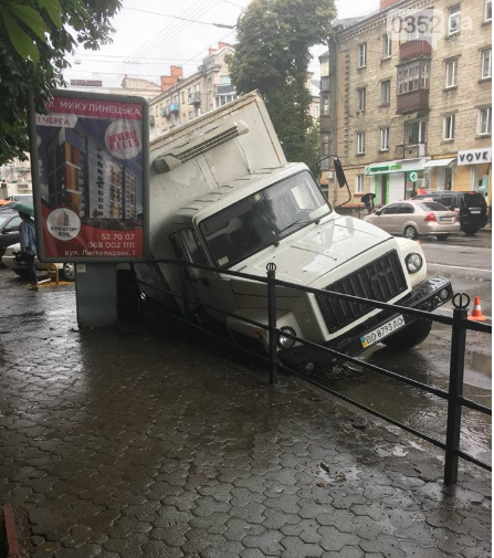 В четверг, 14 июня, в центральной части Тернополя грузовик провалился в яму, которая образовалась в асфальте.