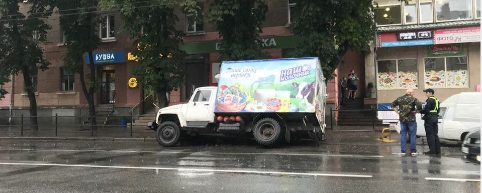 Грузовик с символикой украинской молочной компании провалился сквозь асфальт на улице Русской. Он сильно наклонилась на правую сторону и застрял.
