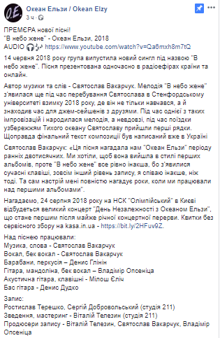 В четверг, 14 июня, группа "Океан Эльзы" выпустила сингл под названием "В небо жене". Песня была представлена в радиоэфире и онлайн.