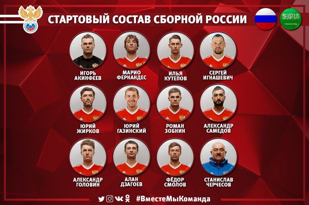 В составе сборной России на поле ориентировочно выйдут: Акинфеев – Фернандес, Кудряшов, Игнашевич, Жирков – Зобнин, Кузяев, Дзагоев, Самедов, Головин – Федор Смолов.
