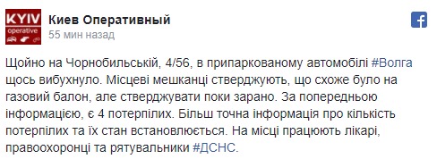 "Только что на Чернобыльской, 4/56, в припаркованном автомобиле Волга что-то взорвалось. Местные жители говорят, что походило на газовый баллон, но утверждать пока рано. По предварительной информации, есть 4 пострадавших. Более точная информация о количестве пострадавших и их состояние устанавливается. На месте работают врачи, правоохранители и спасатели", - говорится в сообщении.