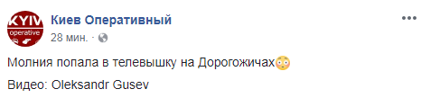 В четверг, 15 июля в Киеве молния попала в телевышку на Дорогожичах. Столицу Украину заливает ливень.