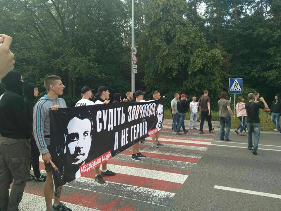 Националисты выступают таким образом в поддержку своих соратников -  Медведько и Полищука, которые сейчас проходят как обвиняемые по делу об убийстве Бузины (очередное заседание как раз состоялось сегодня).